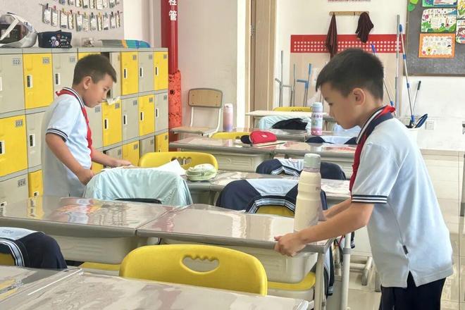 课间,萌宝们自觉将歪了的课桌椅摆齐