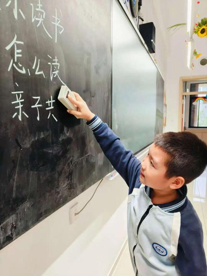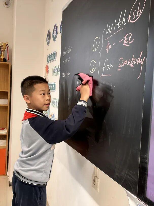 值日生们课间主动擦黑板,整理讲台