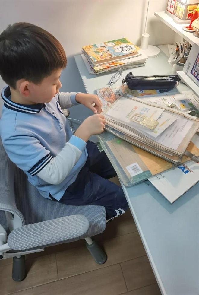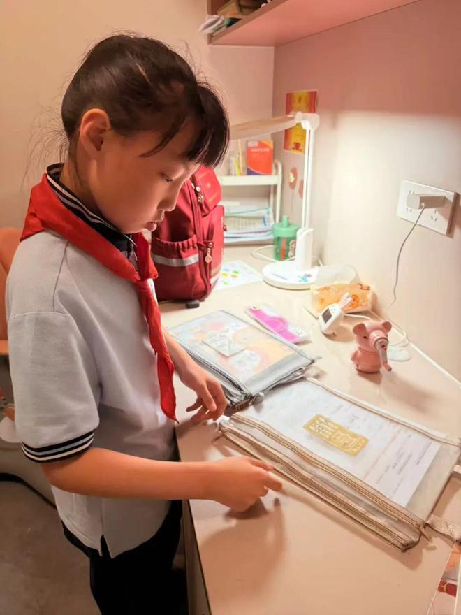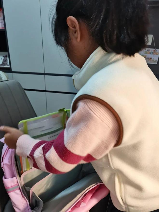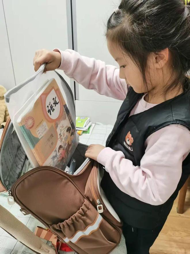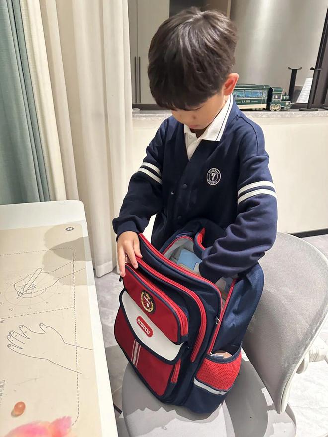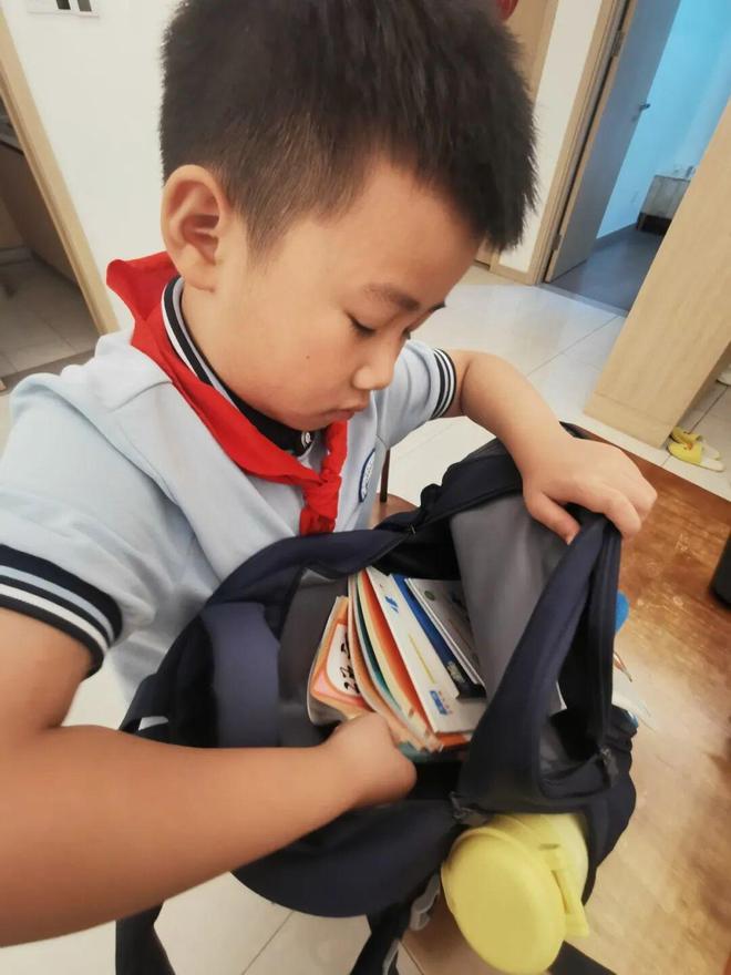 萌宝们自己整理书包,检查第二天要带的书本、文具