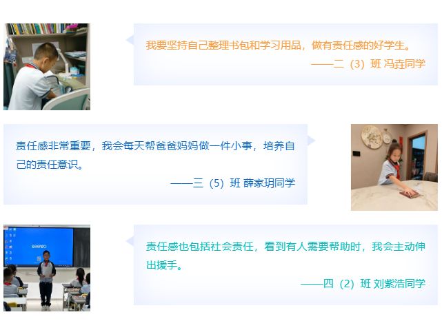 关于“责任感”,红领巾广播站的同学这样说:“责任感,就像是和自己、与家人、同集体之间一份温暖的‘小约定’。对自己,它意味着按时起床、整理好学具,是对自己负责;对家庭,它是主动分担家务、孝敬长辈,是对家人的关爱;对集体,它是珍惜同学的文具、认真完成小组任务,是对集体的担当。做好这些小事,就是在为‘责任感’这座大厦添砖加瓦。”