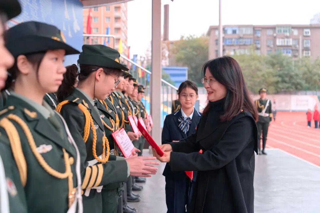 校领导为第五届国旗护卫队的同学们颁发“优秀队员”荣誉证书。