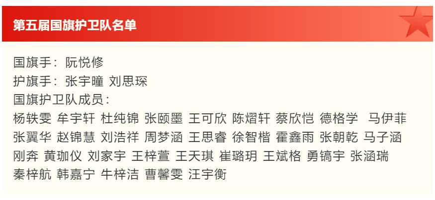 从2024年10月至2025年11月,在这一年的时间里,第五届国旗护卫队的同学们恪尽职守、克服困难、刻苦训练、甘于奉献,精心守护国旗,圆满地完成学校每周一升旗仪式和学校重大活动升旗仪式的任务。